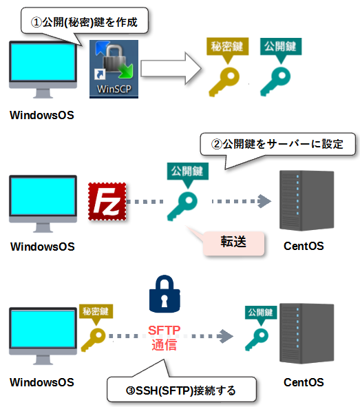 SFTP接続を利用するには、公開鍵と秘密鍵を生成する必要があります。これらの鍵は、サーバーとクライアント間の認証に使用されます。公開鍵はサーバーに保存され、秘密鍵はクライアントに保存されます。認証時には、クライアントがサーバーに公開鍵を送信し、サーバーがその公開鍵を使用してクライアントを認証します。