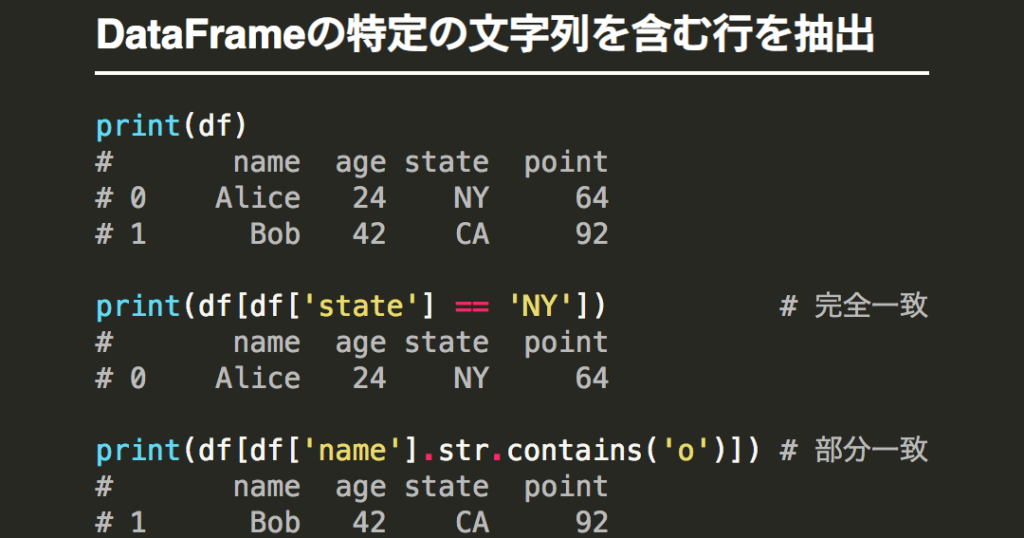 このコードを実行すると、「田中太郎」と「田中三郎」を含む行が抽出されます。str.contains関数は、特定の文字列を含む行を抽出するために非常に便利な関数です。