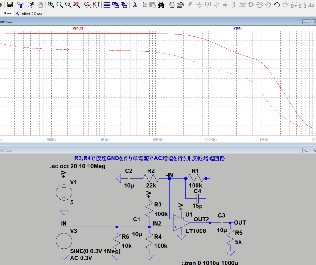 # .ACステートメントを追加した後、シミュレーションを実行するために、LTspiceの「シミュレーション」メニューから「Run」または「F5」キーを押します。シミュレーションが完了すると、周波数応答のグラフが表示されます。このグラフを使用して、回路の周波数応答を確認し、最適化することができます。